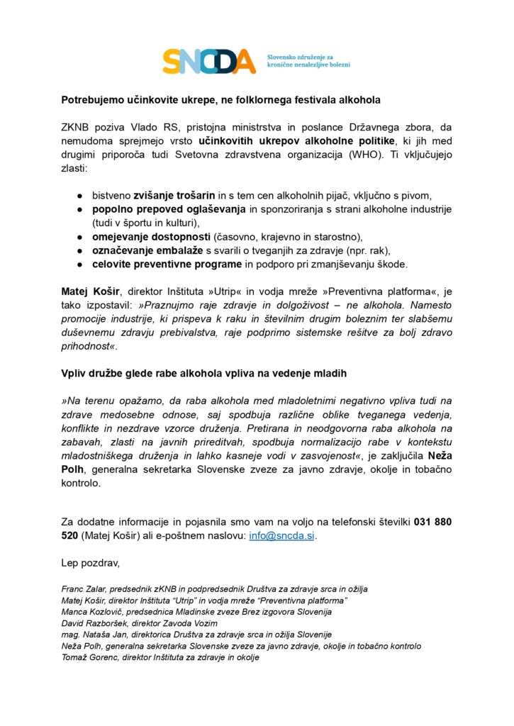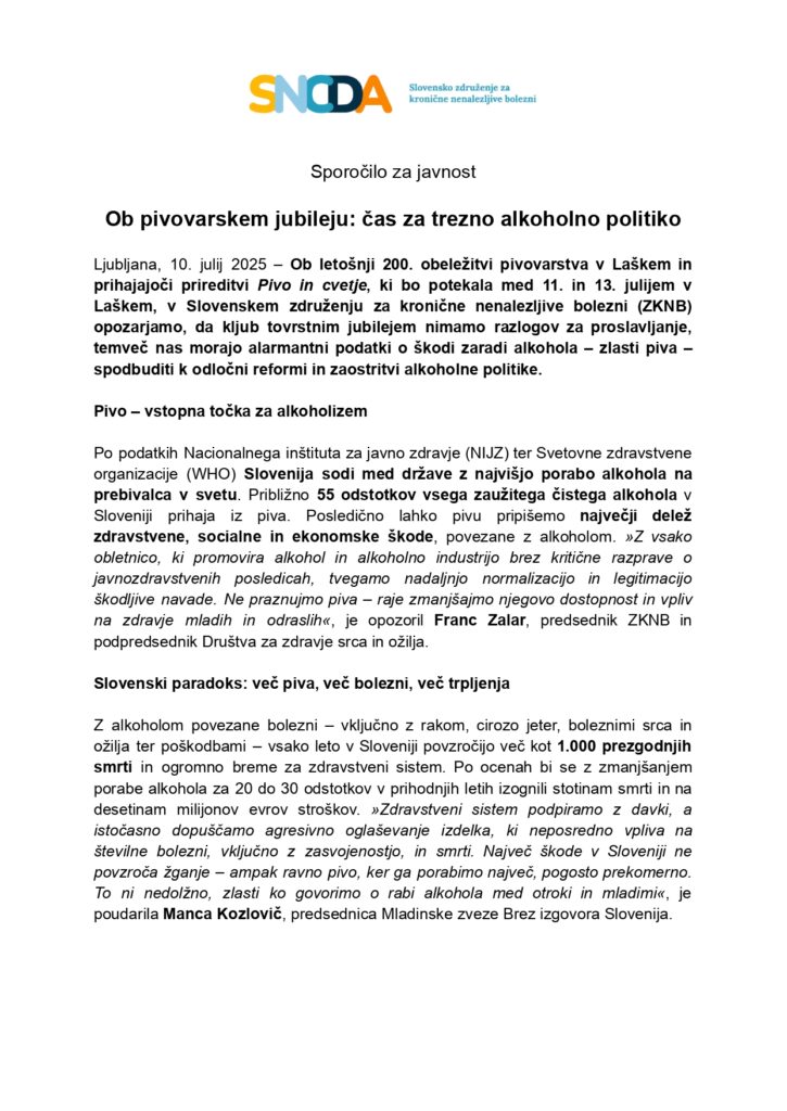 Sporočilo za javnost: Ob pivovarskem jubileju: čas za trezno alkoholno politiko