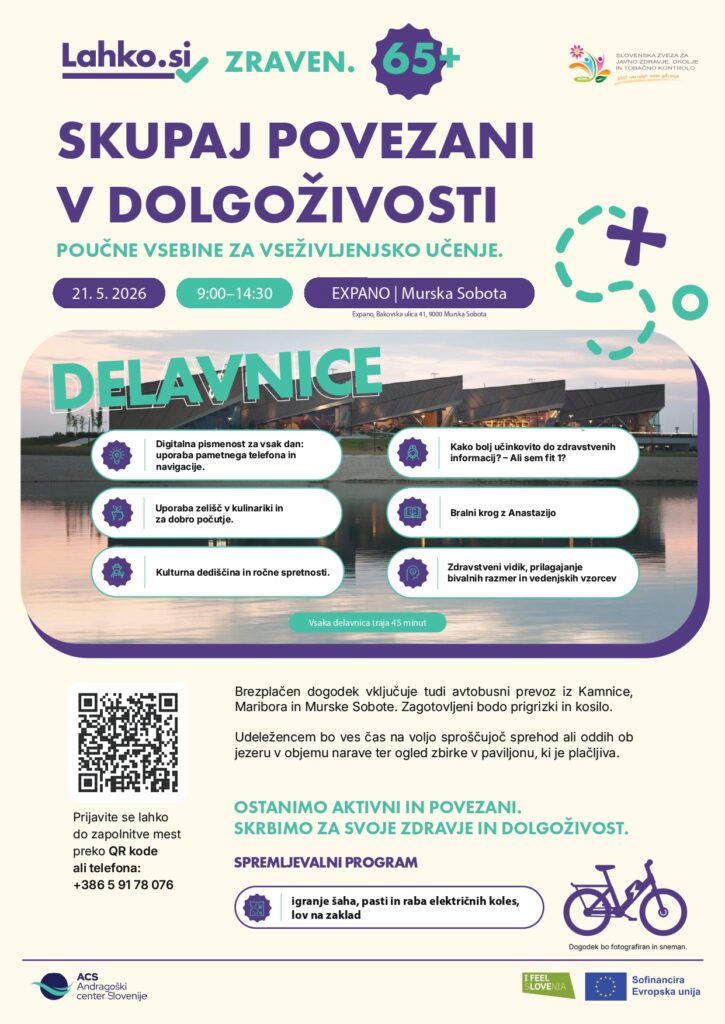 V okviru javnega naročila Andragoškega centra Slovenije Lahko.si zraven 65+ bo Slovenska zveza za javno zdravje, okolje in tobačno kontrolo (SZOTK) izvedla brezplačen dogodek za starejše (65+ let) v Murski Soboti (Expano, Bakovska ulica 41). Dogodek bo usmerjen v vzpodbujanje bralne in zdravstvene pismenosti, v pomen vseživljenjskega učenja, socialne vključenosti in ohranjanja zdravja v 3. življenjskem obdobju. Vključeval bo tudi brezplačen prevoz iz določenih lokacij, kosilo, prigrizke in napitke.